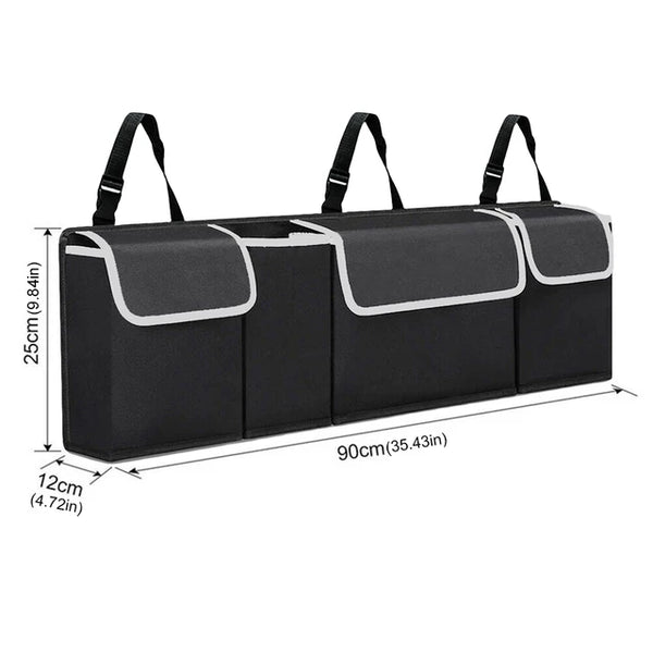 Introducing our Car Trunk Organizer, the perfect solution for a neat and stylish trunk. With four spacious pockets and secure fastener covers, it fits most vehicles effortlessly. Its heavy-duty design ensures durability, while the adjustable headrest strap makes it suitable for all customers. Say goodbye to cluttered trunks and hello to hassle-free journeys with our convenient organizer.