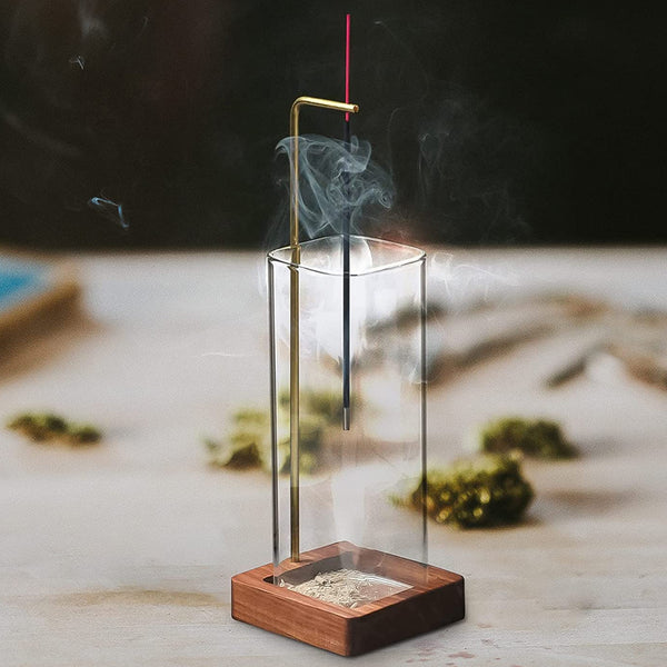 This incense holder is made of the finest wood and has a high-quality golden brass stand. It has a sturdy holder that grabs your incense tight and the glass cylinder fits perfectly into the base unit to capture all of the ash and when the sticks are all done burning, the glass cylinder can be removed so you can empty it.