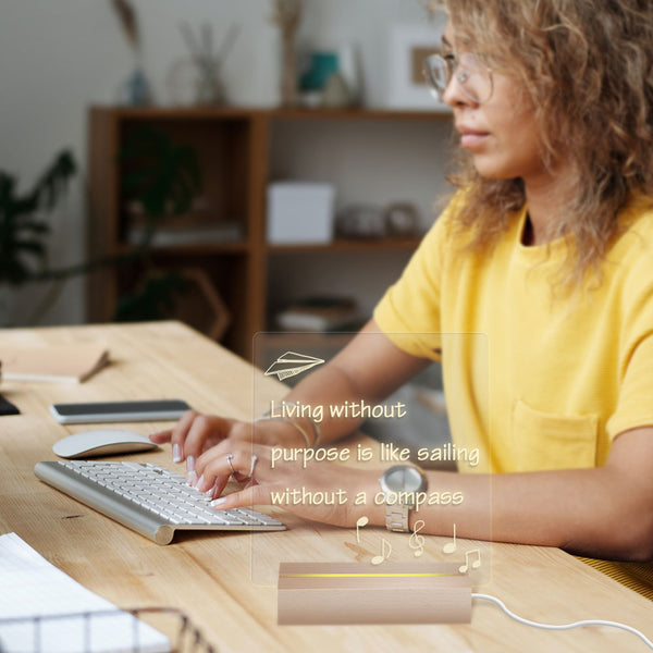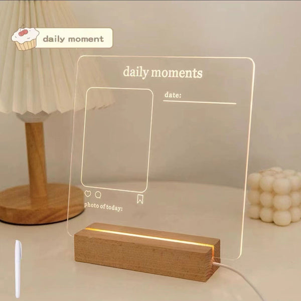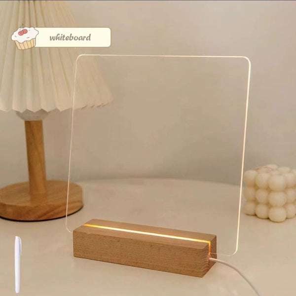 The writing board’s wooden base is embedded with an LED