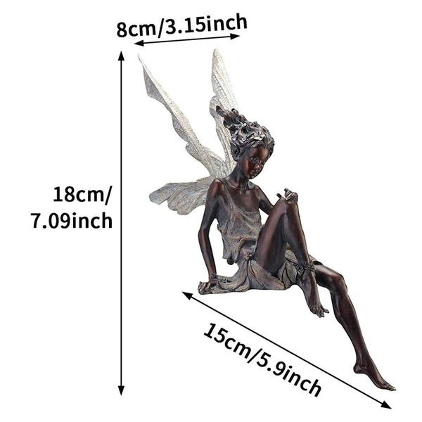 fairy sculpture has a pair of beautiful wings. She sits somewhere with her