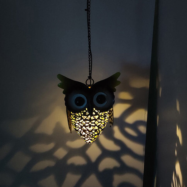 with owl feathers and a removable owl face on the conical metal lampshade. The