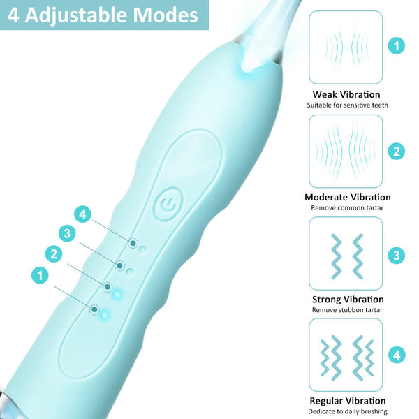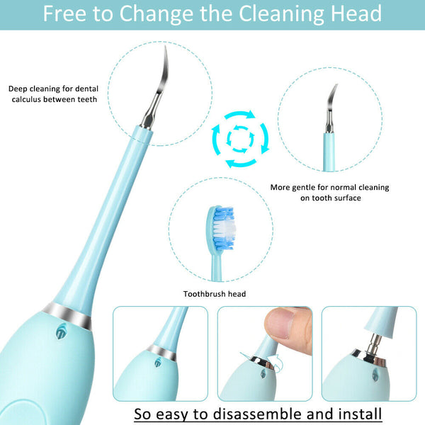 The body of this tartar-removing device is made with safe and hygienic food-grade silicone, 2 different small metalheads can effectively scan the deep blind area of the teeth, the sharp cleaning head is used to remove tartar calculus between teeth, the flat cleaning head is used to remove the dirty mark left by tobacco, cola, and tea, while the 2 brush heads are for cleaning your teeth.