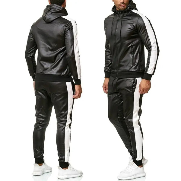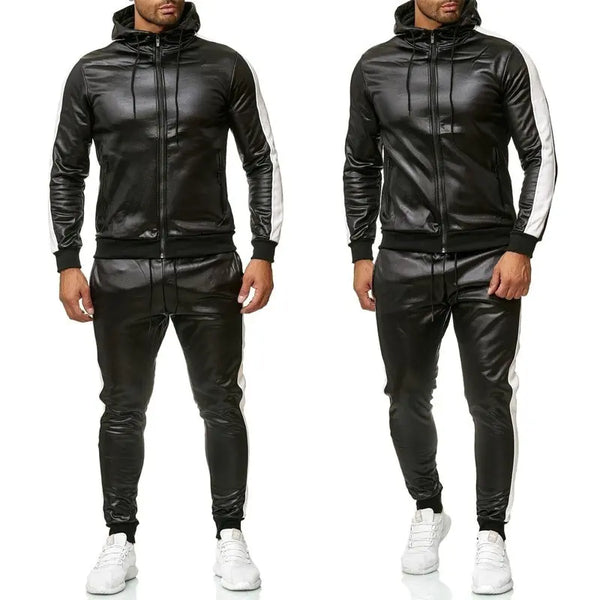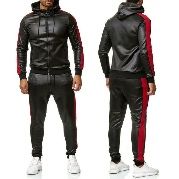 Elevate your casual style with the ZOGAA Men's Sweat Suit Hooded Jacket Pants Set. This two-piece sweat suit includes a hooded jacket and matching pants, both made from high-quality PU leather. It's perfect for a casual, yet fashionable look and provides the comfort you need for jogging or lounging. Embrace a sporty and stylish appearance with this tracksuit, ideal for both casual outings and athletic activities.