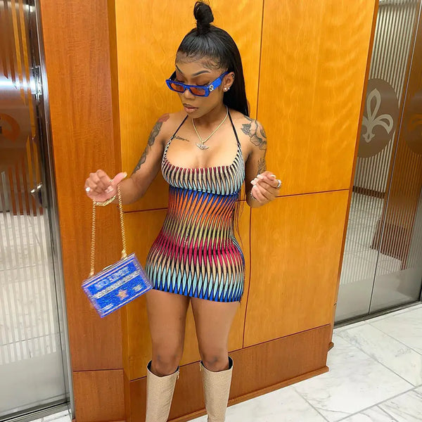 Look dazzling in the Gradient Mesh Mini Dress. This mini dress is tailored perfectly to show off your curves while keeping you comfortable. Ideal for formal or casual outings, the bold and unique design features a halter neckline, sleeveless silhouette, and backless style with a lace up closure. Crafted from high-quality polyester, this dress features a geometric gradient pattern that creates an eye-catching effect. Expertly designed with a bodycon/slim fit and just above the knee length, this chic mini dress will make heads turn wherever you go! Give yourself a fashion update with the stylish and sophisticated Gradient Mesh Mini Dress.