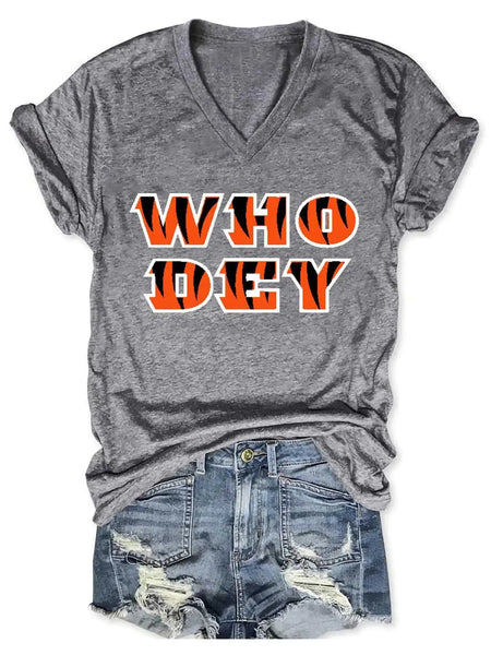 Welcome the Women Who Dey V-Neck Shirt to your wardrobe. This stylish t-shirt is a must-have for any fan of the Cincinnati Bengals, showcasing the iconic team and motif in bold colors and design. The breathable poly-cotton blend ensures a long-lasting oxygenated comfort as you wear it day in and day out, whether cheering on your favorite team or running errands around town. Simply pair it with denim bottoms and sneakers for an effortless yet striking look. The vivid print won't fade over time, ensuring that you can represent the Cincinnati Bengals with pride for years to come. Perfect from casual Friday at work to game day Sunday with friends - show your support in style with the Women Who Dey V-Neck Shirt!