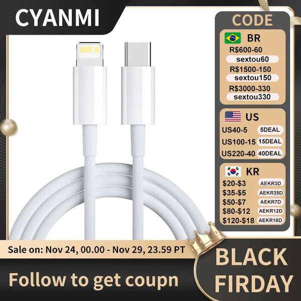 Introducing PD Fast Charging Type C to Lightning. Our charging cable is made with cutting-edge technology and offers unparalleled speed and convenience. This Apple MFI certified USB cable has a durable design that supports 27W Power Delivery (PD) fast charging technology, allowing you to charge your compatible iOS devices quickly and efficiently. With a reinforced connector, this CYANMI charger cable is highly durable and resistant to corrosion. The advanced safety protocols of this cable ensure that you get the most reliable charge experience every time while protecting your valuable device from unwanted power surges or short circuits. With its hassle free cable length of 1 meter, it's long enough for comfortable use but not too long for portability needs. Perfect for homes, offices, cars — wherever you need fast charging! Shop now and use PD Fast Charging Type C to Lightning for an unparalleled charge experience.