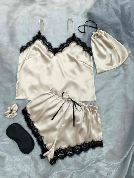 Introducing our exquisite "Lace Dreams Pajama Set," meticulously crafted to elevate your evenings with unparalleled comfort and sophistication. This thoughtfully curated ensemble embodies luxury and relaxation, featuring delicate lace trim adorning the cami and shorts, offering a touch of elegance to your nighttime routine. Drift into a restful slumber with the included eye mask, designed for optimal comfort and blackout. Complete your bedtime ritual with the matching scrunchie to keep your hair effortlessly styled, while the coordinating bag ensures convenient storage or travel. Embrace tranquility and grace with our Lace Dreams Pajama Set, where comfort meets timeless beauty.